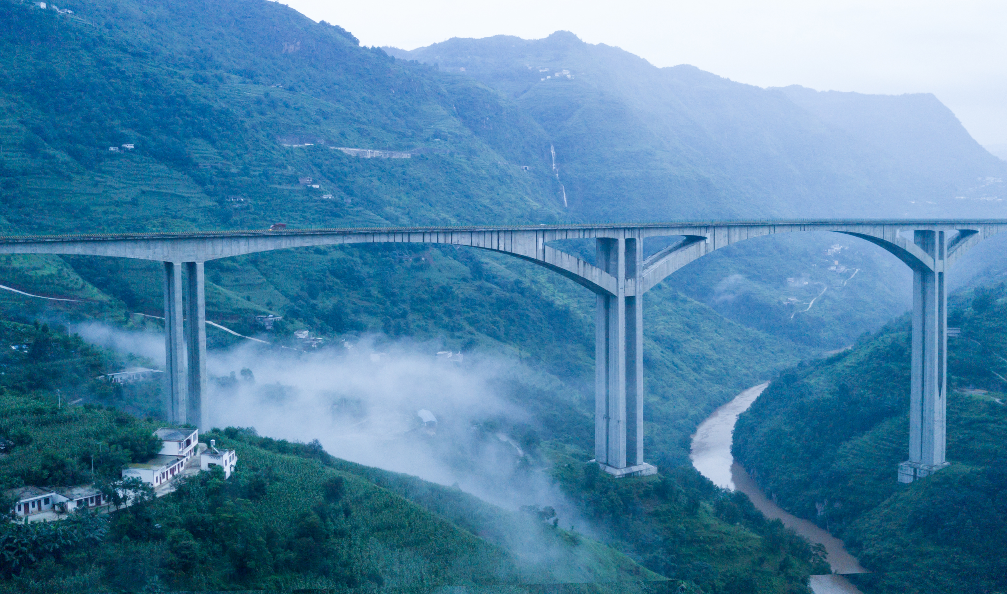 水盤高速公路北盤江特大橋全長1261m,主跨290m,是目前亞洲最大跨徑的預應力混凝土連續(空腹式)斜腿剛構,被譽為“世界第一腿”。其空腹式結構形式填補了跨徑在200~400m之間缺乏經濟適用橋型的空白;研發了“下弦采用斜爬掛籃結合臨時扣掛系統懸澆,上弦采用支架結合移動模架滯后下弦節段現澆”部級施工方法,并研制了大傾角、變曲率、可斜向行走的上置斜爬式掛籃國家發明專利。大橋于2013年8月16日建成通車。
